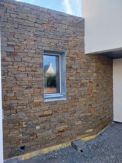 Habillage de façade en placage de pierre naturelle St Yrieix sur une construction neuve. La pierre a été posée sur plusieurs pans de murs extérieurs, intégrant fenêtres et baies vitrées avec des finitions soignées. Le contraste entre l'enduit blanc et la pierre naturelle apporte un cachet authentique à cette maison contemporaine.